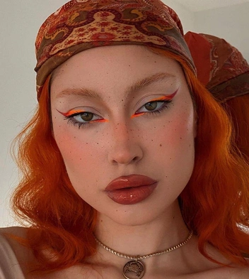 Оранжевый — очень жизнерадостный цвет, который поднимет настроение, даже если вы просто сделайте небольшой акцент в уголке глаза. Второй вариант — сделать огненно-оранжевые стрелки с прорисованным «клювиком» в уголке глаза.