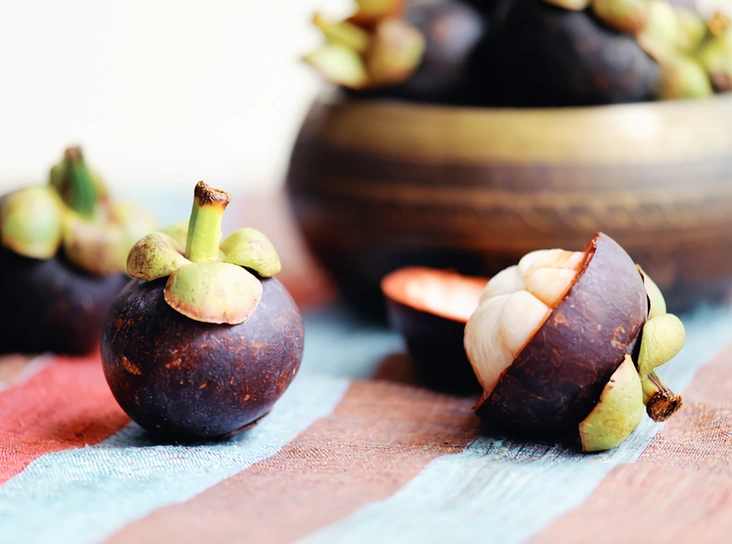Плод мангостина имеет круглую форму и сверху покрыт толстой бордово-фиолетовой кожурой, под которой находится 4-8 сегментов белой съедобной мякоти с плотно прилегающими к ней семенами. Родиной мангостина считается Юго-Восточная Азия. Фрукт также культивируется в Таиланде, Мьянме, Вьетнаме, Камбодже, Малайзии, Индии, на Шри-Ланке, Филиппинах, Антильских островах, в Центральной Америке, Колумбии, тропической Африке. Мякоть фрукта имеет сливочно-сладкий и несколько терпкий вкус.