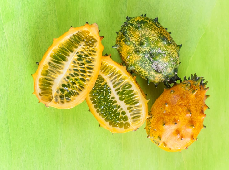 Кивано (плод часто называют «рогатой дыней») представляет собой овальный, похожий на каштан, плод, покрытый мягкими толстыми шипами. Произрастает этот экзотический фрукт во многих странах Южной Америки и Южной Африки. Кивано имеет зеленую желеобразную мякоть с большим количеством белых семян, а мягкие прожилки делят ее на многочисленные сектора. Мякоть кивано кисло-сладкая на вкус, слегка напоминает огурец и отлично освежает в жару.