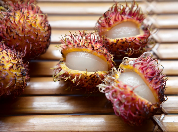 Рамбутан представляет собой плодовое тропическое дерево семейства сапиндовые. Чаще всего его можно встретить в странах с тропическим климатом, таких как Индонезия, Малайзия, Юго-Восточная Азия и Таиланд. Название этого необычного фрукта произошло от индонезийского слова rambut, что в переводе на русский язык означает — волос. Собственно, своеобразные волоски, покрывающие кожуру рамбутана являются его главной отличительной особенностью или даже изюминкой. Плоды рамбутана по виду напоминают грецкие орешки. Определить спелость фрукта можно по цвету: цвет спелого фрукта всегда более насыщенный. Чаще всего встречаются красноватые или розовые плоды рамбутана, но, в зависимости от сорта, он также бывает желтым, красновато-оранжевым и даже белым. Внутри рамбутаны имеют белую мякоть, похожую на желе и необычайно вкусную, а также косточку в 2-3 см.