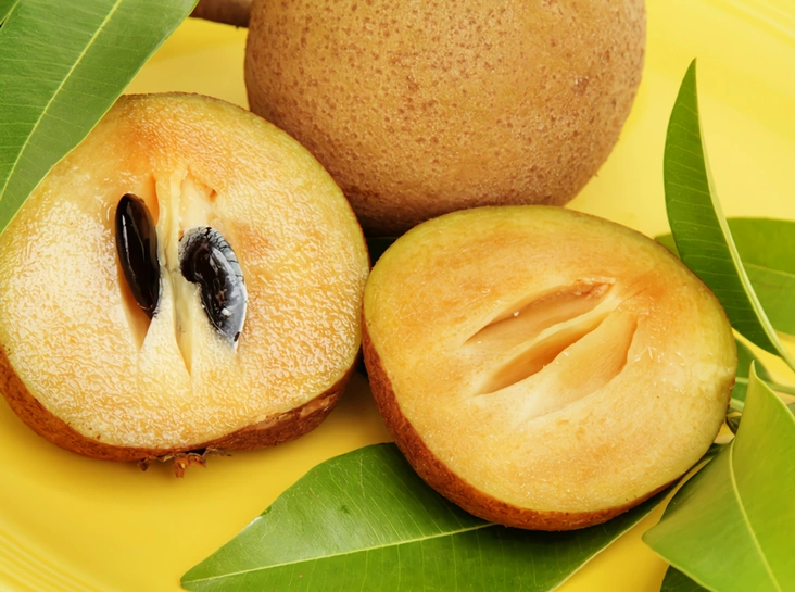 Плоды саподиллы имеют округлую или овальную форму. Саподилла происходит из тропических районов Америки. Спелый плод саподиллы имеет коричневатую кожуру с нежной и немного зернистой мякотью под ней. Мякоть состоит из волокон, напоминающих волокна хурмы. По вкусу мякоть очень сладкая, а если плод слишком спелый, то она может быть приторно сладкой. Аромат фрукта при нарезании достаточно тонкий, а вкус наиболее похож на сухофрукты.