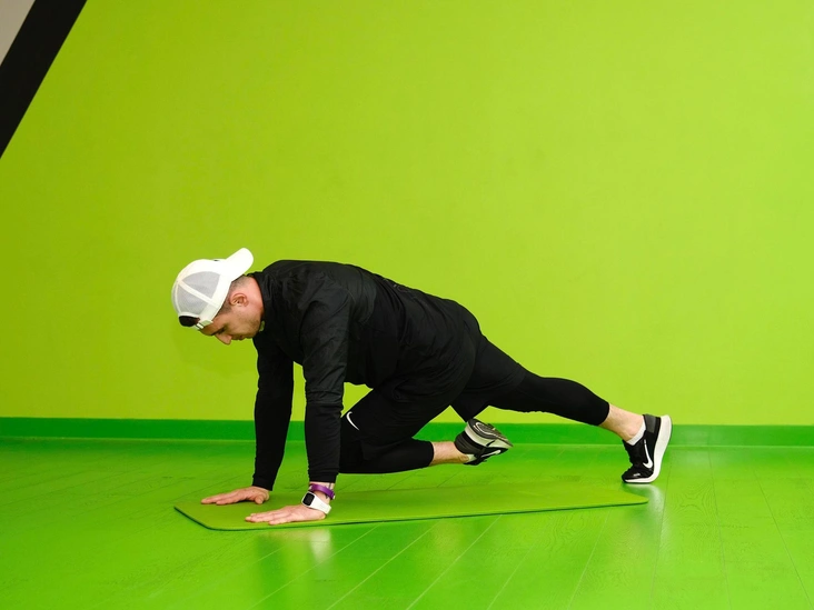Исходная позиция — классическая планка: кисти под плечами, ноги прямые, стабильное положение корпуса с сохранением естественных изгибов позвоночника. На выдохе потянитесь левым коленом к правому локтю.Следите, чтобы корпус сохранял заданную траекторию. Выполните 10–20 повторений, чередуя стороны.