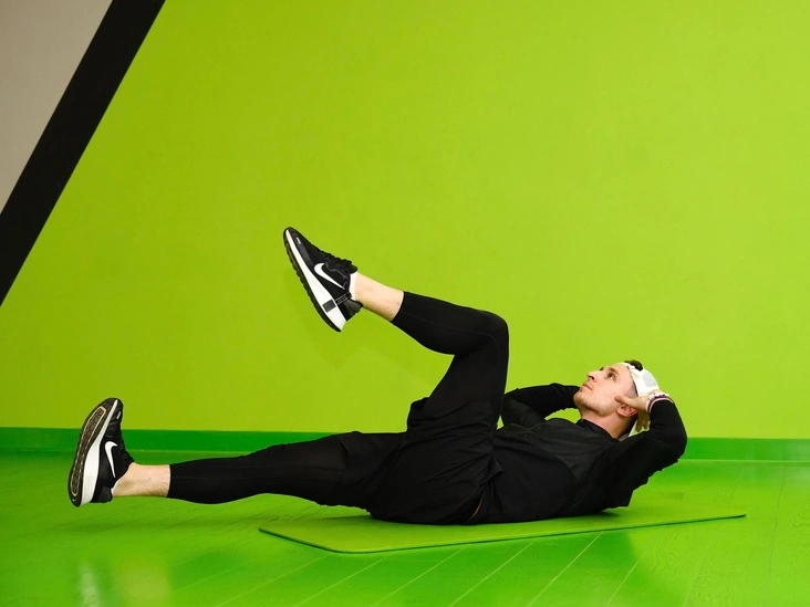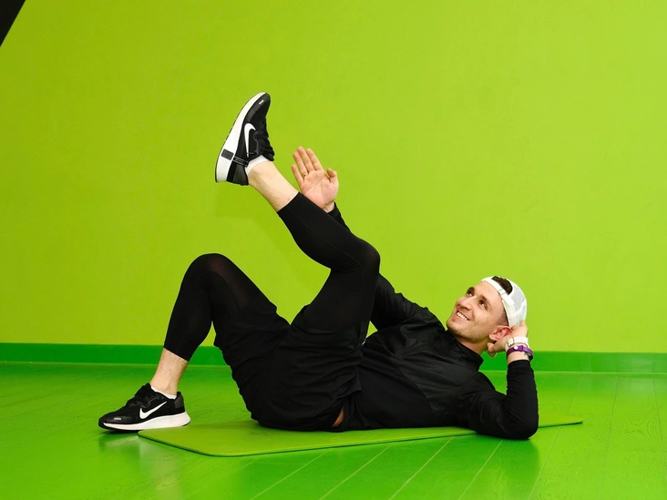Из исходного положения лежа на спине выполнитескручивание корпуса. Правой рукой тянитесь к левой ноге, в конечной точке сделайте выдох, придерживая голову.Чередуя стороны, выполните 10–20 повторений. В данном упражнении акцент делается на косые мышцы живота.
