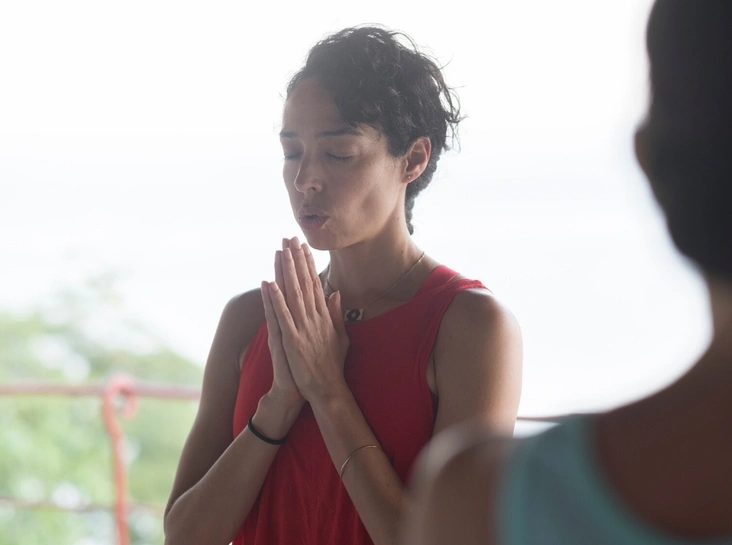Завершаем пранаяму, выполняя глубокий вдох и медленный выдох. Затем делаем вдох, складываем губы трубочкой и выдыхаем все через рот. Повторяем еще раз.