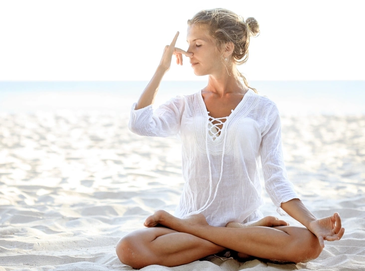 Нади Шодхана Пранаяма. Выдохните. Закройте правую ноздрю, вдохните воздух через левую, закройте ее и выпустите воздух правой. Повторите этот цикл несколько раз.