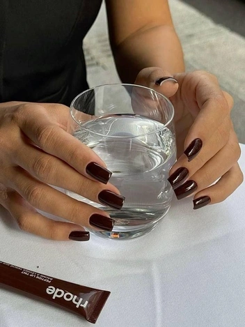 Темные оттенки лучше смотрятся на короткой или средней длине. Мягкий квадрат или овал подчеркивают глубину цвета. Слишком длинные ногти могут утяжелять образ. Оптимальный свободный край — 1–2 мм.