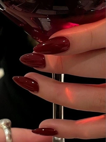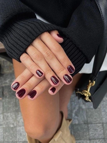 Этот цвет уже давно закрепился в осенней палитре, но в 2025 году он стал еще более актуальным. Его сила в том, что он не уходит в мрачность, а сохраняет теплую основу, напоминающую оттенок спелого винограда или бархатного вина. Винный удачно смотрится с верблюжьим пальто, классическим темным денимом, шерстяными юбками и свитерами в песочных или серых тонах. На ногтях он создает впечатление собранности и уверенности, при этом не выглядит слишком жестко.