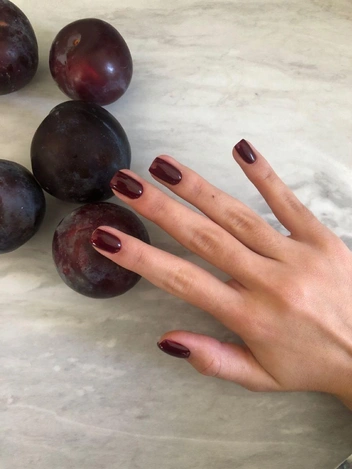 Сливовый цвет всегда воспринимался как более холодная альтернатива винному, но осенью 2025 его вариативность раскрылась по-новому. Этот оттенок напоминает поверхность стеклянной ягоды или насыщенный шелк. В прозрачной версии сливовый выглядит мягко и деликатно, создавая эффект легкого свечения ногтевой пластины. В плотной текстуре он становится графичным, словно очерчивая силуэт руки.
