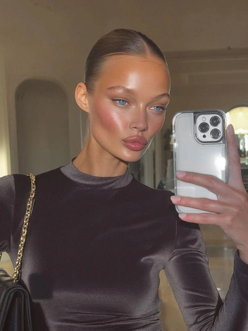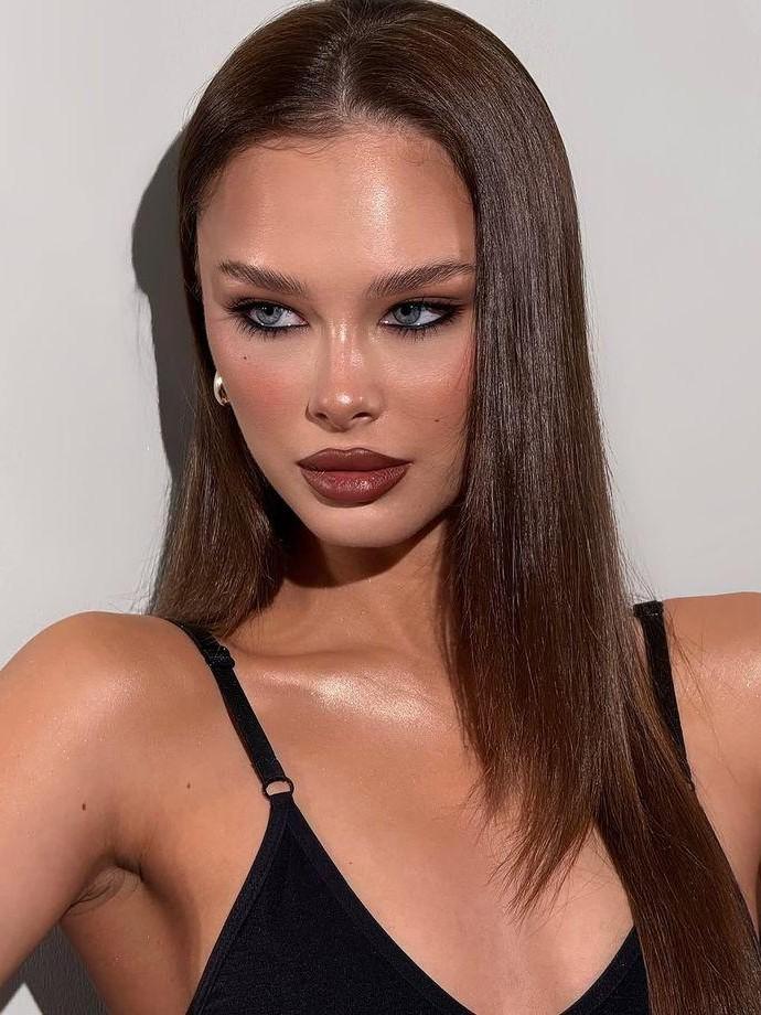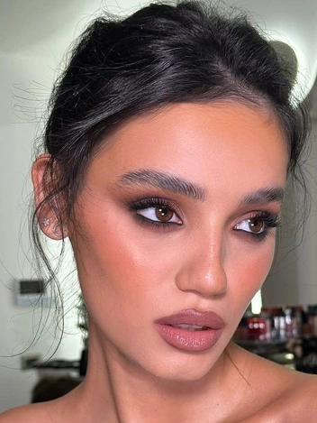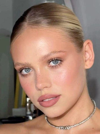 Кожа — гладкая, с естественной плотностью. Тон наносится тонким слоем, корректоры — точечно. Пудра используется минимально, чтобы сохранить живую текстуру. Глаза оформляются тушью и легким оттенком на веке. Губы в той же гамме, что и румянец. Такой образ подходит тем, кто хочет мягкий, спокойный макияж, который не теряется в вечернем свете (читайте также: Причина мягкого взгляда — коричневая тушь: 10 проверенных и лучших).