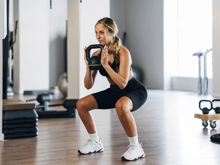 Правильная техника: колени направлены на носки, но не заходят за них. Это необходимо, чтобы избежать травмы коленного сустава. Ягодицы выведите максимально назад — так, чтобы задняя поверхность бедра была параллельна полу. Встаньте на выдохе с жимом в пятки, при этом почувствуйте, как сокращаются ягодичные мышцы. Поднимайтесь, напрягая ягодицы, а не колени или спину (читайте также: «Самые эффективные упражнения для ягодиц»).
