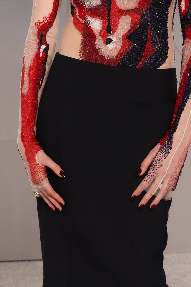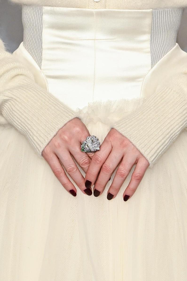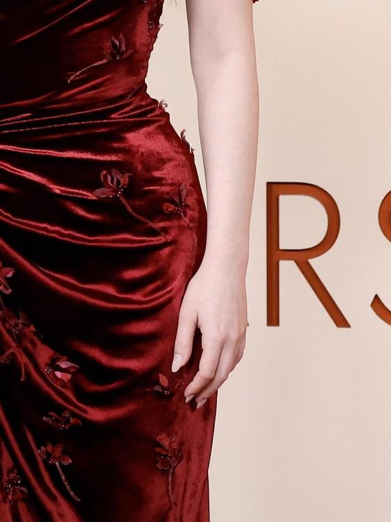 Этот безвременный оттенок часто мелькал и в нарядах. Его выгуляли Майки Мэдисон в корсетном платье Vivienne Westwood и Виттория Черетти в лаконичном образе Alaïa. Однако гораздо больше бордового оказалось на ногтях. Сара Полсон выбрала глубокий винный — настолько темный, что издалека он походил на черный — а Кара Делевинь сделала ставку на кровавый цвет, удачно перекликавшийся с ее сложным нарядом Thom Browne.