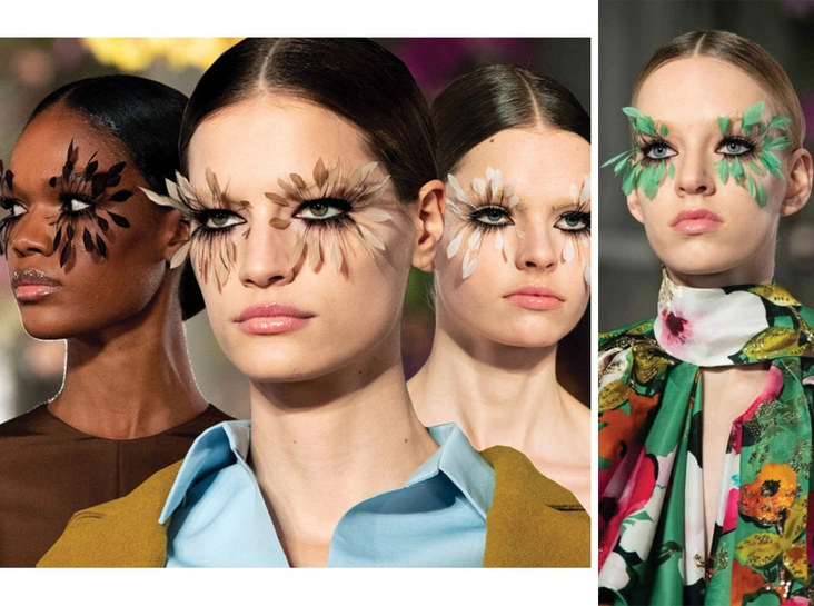 Многообразие цветовой палитры вновь возвращается в макияж ресниц. Визажисты все чаще делают акценты на глазах, используя цветную тушь, лайнеры и нестандартные декоративные элементы. Так, на показе Valentino к ресницам были приклеены перья, а Vivienne Westwood по-новому взглянула на длинные накладные ресницы, вернув им былую актуальность.