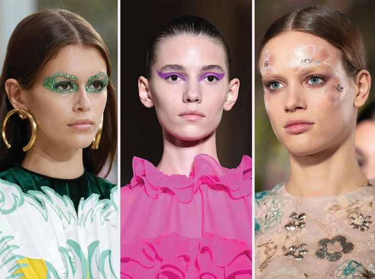 В рамках летне-весеннего показа 2019 Valentino устроил из скучной повседневной косметической рутины вечный карнавал красок: стрелки с глиттером, яркие широкие цветные геометрические и флористические узоры завоевали сердца гостей модного дефиле.