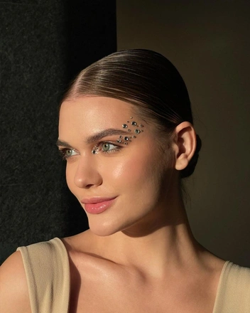 Знаем, что макияж выглядит слишком сложным для повторения. Однако сделать его помогут самоклеящиеся стразы или жемчуг: клеить лучше на чистую кожу или на клей для ресниц. Для макияжа важна симметрия, поэтому прикреплять стразы нужно одновременно на каждое веко.