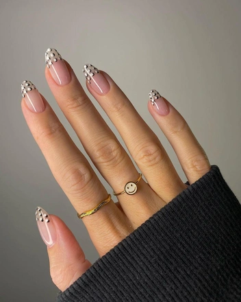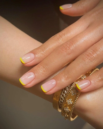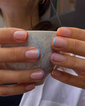Тут все просто, короткие ногти овальной формы, прозрачное или нюдовое покрытие и тонкая полоска линии улыбки. Главные преимущества такого покрытия — короткие пальцы и ногти визуально удлиняются, благодаря цвету ногтевого ложа, которое подбирается под ваш оттенок, а носить этот маникюр можно долго, не переживая, что станет заметно отросшее покрытие, особенно актуально, если собираетесь в долгий отпуск. Для свободного края можно выбрать не только белый, но и другие оттенки: пастельные или яркие (читайте также: На любой случай: 12 трендов маникюра, которые будут в моде в 2023 году).