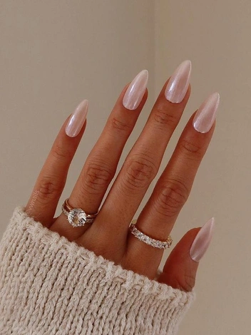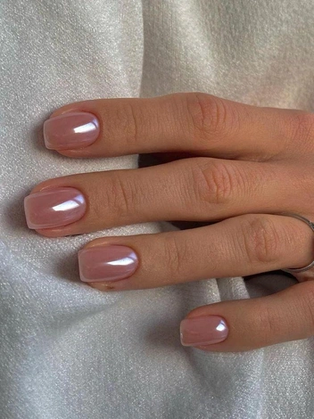 Классический вариант этого маникюра — белая основа и перламутровый топ, создающий тот самый сияющий финиш. Нейл-стилисты на показах модных домов также использовали варианты с классическими хромовыми оттенками, которые создают такой же ярко выраженный глянцевый блеск на ногтях. Можно ли это повторить? Легко! «Глазированный» маникюр создается с помощью полупрозрачного лака и втирки — частиц полимерного пигмента (читайте также: Маникюр «богатой девушки»: что нужно знать о новом тренде (и как его повторить)).