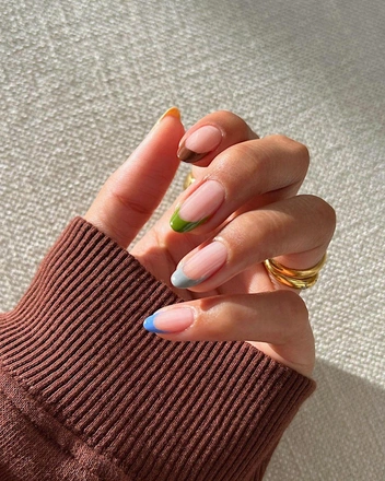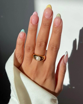 Тем, кому хочется весной яркости и нежности, понравится разноцветный френч-дизайн в пастельных тонах. Конечно, когда хочется много ярких и сочных красок, почему не добавить такие же акценты и на свои руки? В сочетании с платьями в цветочный принт такой френч будет смотреться беспроигрышно. Главное помните, что лучше выбирать форму ногтей миндаль или овал, а длина не должна быть очень большой, чтобы маникюр не выглядел вызывающе.