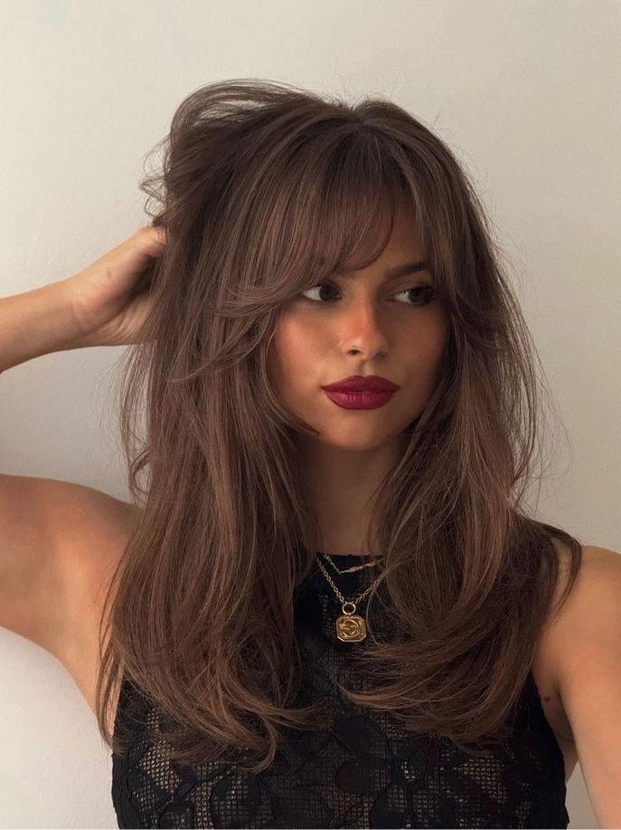 Лонг‑шер — удлиненная версия шэра с более спокойной градуировкой. Здесь стрижка комбинирует объем на макушке, удлиненные пряди у лица и достаточно длинный периметр. Челка встраивается в этот рисунок как первый слой, затем плавно переходит в пряди до ключиц и ниже.