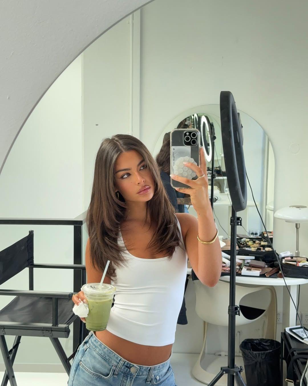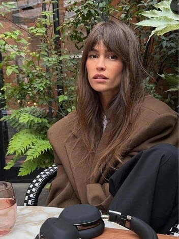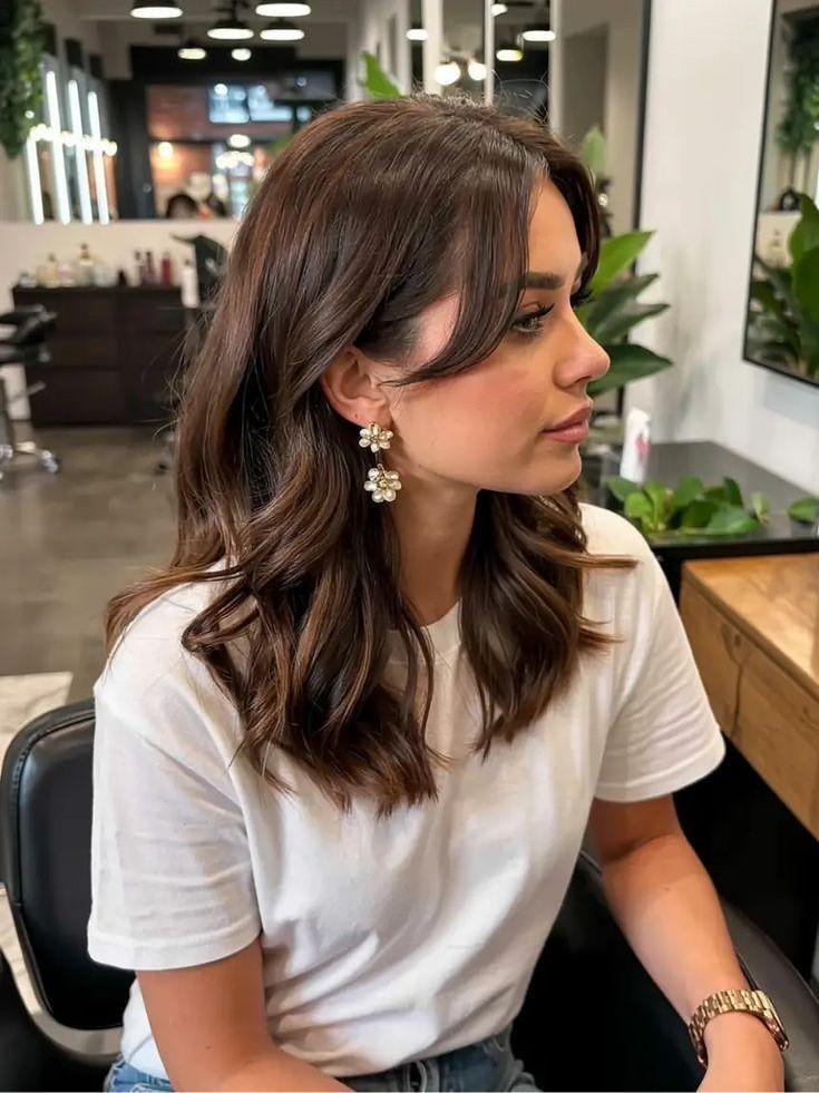 Челка здесь превращается в самый короткий фронтальный слой, который переходит в более длинные пряди к подбородку и ниже. При этом основная длина остается заметно длиннее, что визуально вытягивает силуэт. Итальянка хорошо работает на средней и большой густоте, на прямых и слегка волнистых волосах. Укладка — фен и брашинг или объем у корней плюс легкое подкручивание концов. В результате даже на этапе непонятной длины челки лицо обрамлено структурированными, но мягкими линиями, а не ровной и тяжелой стеной волос.