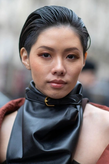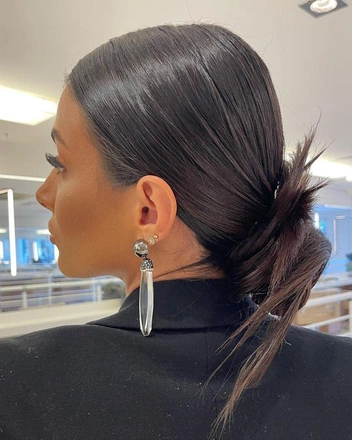 Эта прическа понравится обладательницам коротких волос, так как на такой длине гладкая укладка выглядит еще более выигрышно. Чтобы повторить прическу, нанесите на всю длину пасту или глину для волос, чтобы пригладить пушок по всей длине и надежно зафиксировать пряди. Зачешите волосы от лица и распределите стайлинг по всей длине, чтобы укладка выглядела гармоничной.