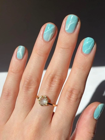 Важно помнить: аквамарин — не один цвет, а целая палитра. Есть более холодные, с голубизной, и теплые, с зеленоватым подтоном. Для светлой кожи идеально подойдут пастельные, почти полупрозрачные аквамариновые лаки. На смуглой коже особенно эффектно смотрится насыщенный глубокий тон — ближе к бирюзе или даже к цвету морской пучины.