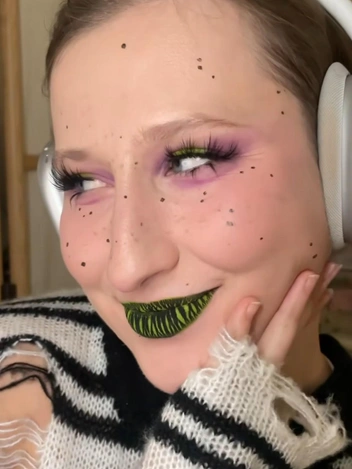 К премьере фильма «Битлджус Битлджус» бьюти-блогер Адриана Калиш придумала, как изобразить фирменный рисунок с костюма главного персонажа в своем макияже. Для этого она наносит ярко-зеленую помаду, после чего сжимает губы в форме поцелуя и, следом, вбивает пигмент черного цвета. Когда губы расслабляются, появляется тот самый эффект контрастных вертикальных полос.