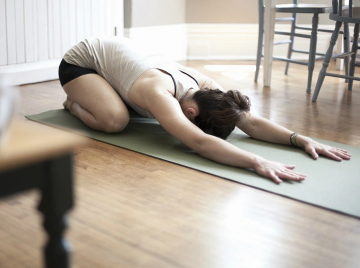 - Сделайте выдох наклонитесь вперед: живот положите на бедра, положите лоб на пол.