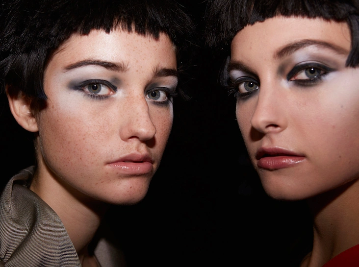 Наносим на всю поверхность подвижного века (и слегка – на область вокруг нижнего) полупрозрачную матовую Micro-fil Loose Powder, поверх которой мягким кремовым средством Eye&Brow Maestro (оттенок Obsidian Black) проводим линии, очерчивающие контур глаза, и тщательно растушевываем. С помощью хайлайтера (можно воспользоваться жидким флюидом-хайлайтером Fluid Sheer) делаем световые акценты в центре подвижного века и во внутренних уголках глаз. Глаза должны быть яркими и контрастными, но – внимание! – ресницы можно оставить ненакрашенными.
