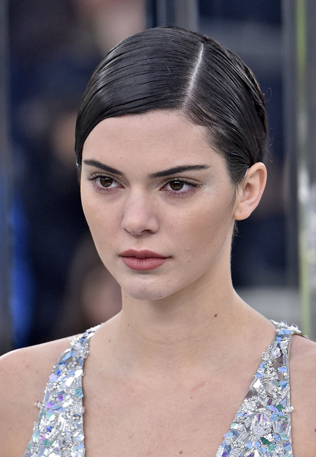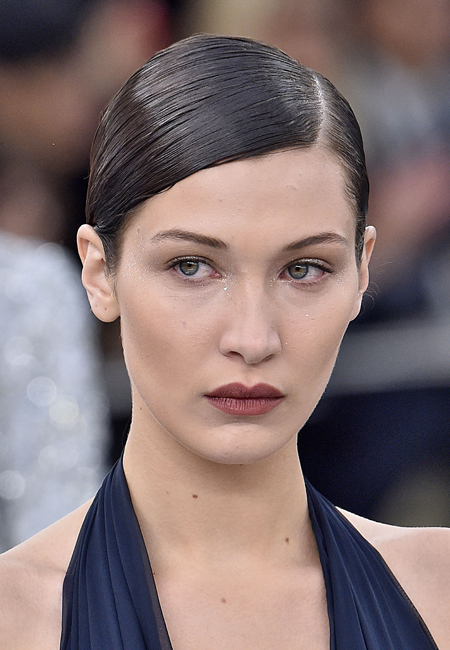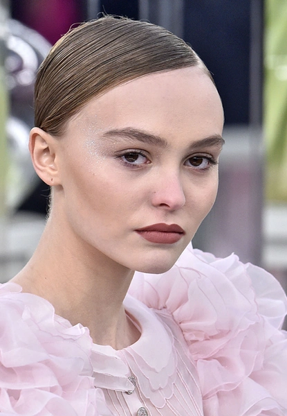 Beauty-образ был дополнен кирпичными румянами и сатиновой помадой бежево-коричневого оттенка с четким контуром. Визажист также использовал золотисто-песочную палетку теней для глаз, чтобы добавить блеска взгляду.