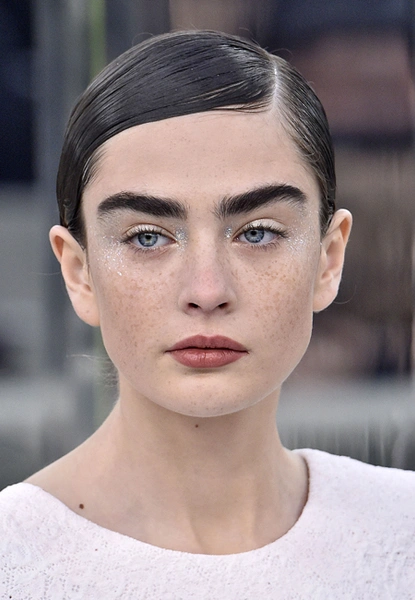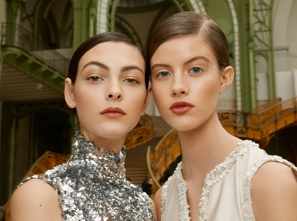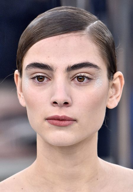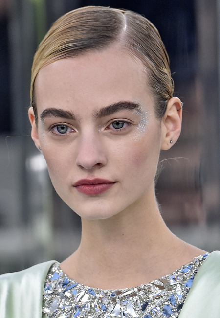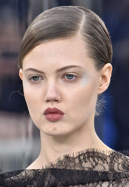 Кутюрная коллекция модного Дома традиционно апеллировала к ультимативной женственности. Макияж и прически отражали общее настроение показа и представленных образов. Чувственный нюд, выполненный в теплых кирпично-бежевых тонах, стал лаконичным минимумом для последующей техники стробинга. Так, серебряные блестки с эффектом металлик визажист наносил на все веко, на скулы и виски.