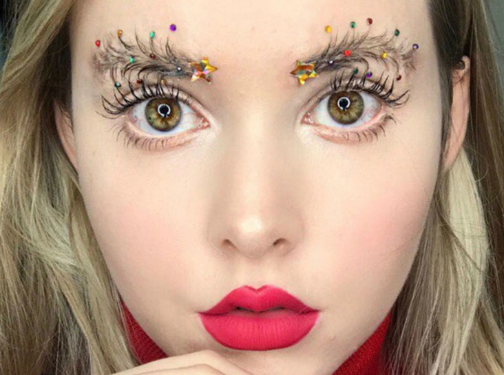 Украшать брови стразами совсем не так просто: этот навык требует завидной ловкости рук. Плюс нужно признать, что блеск создает довольно праздничный вид.