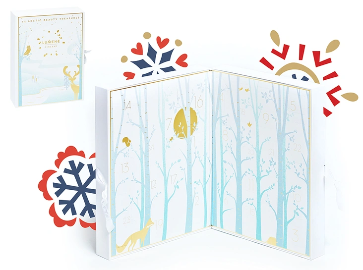 Адвент-календарь, прибывший из Финляндии, вдохновлен северной природой и завораживающими зимними ландшафтами. В основе его дизайнерского оформления ─ образ финских березовых лесов, населенных величественными оленями, арктическими лисами и таинственными совами. В календаре вы найдете 19 уходовых средств (среди них бестселлеры серий Nordic Hydra, Nordic-C, Nordic Detox и Nordic Rituals) и продукты для макияжа (консилер, воск для бровей, тени-карандаш, помада). Отличительная особенность Lumene ─ натуральные ингредиенты (северный гриб Чага, арктическая морошка, кора северной сосны, чистая родниковая вода) ─ порадует любителей органики.