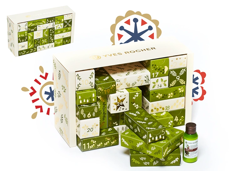 Адвент-календарь представляет из себя 24 ящичка-коробочки, в которых спрятаны косметические и парфюмерные бестселлеры французской марки. Здесь вы найдете уход для тела (гоммаж, смываемый бальзам, молочко, крем для рук), для волос (шампунь и маску), продукты для ухода за лицом и макияжа, ароматы Oui à l’Amour и Mon Evidence в мини-форматах 5 мл. Кстати, зеленая упаковка подарка не случайна: картон изготовлен из древесины подведомственных лесов, где внимательно следят за сохранностью окружающей среды, а сами коробочки можно использовать повторно или отдать на переработку. Экозащитники точно оценят.