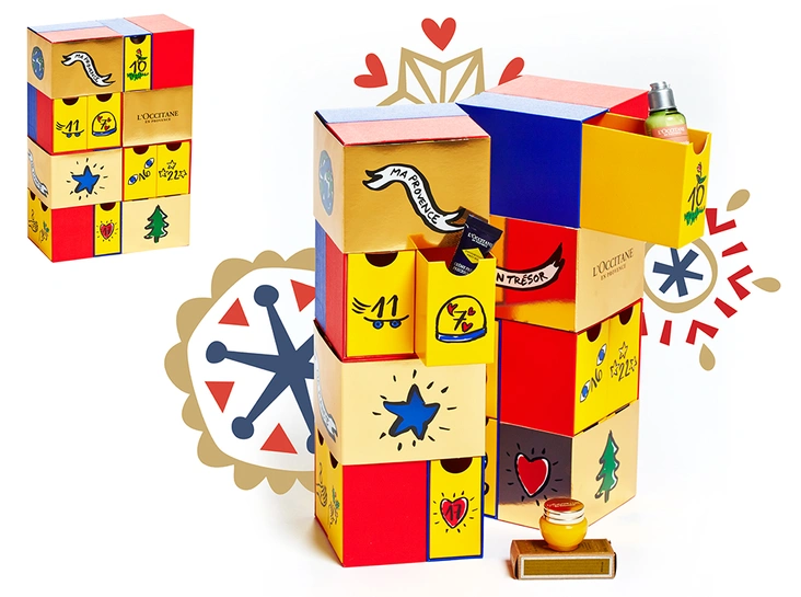 Дизайн этого без шуток премиального адвент-календаря разрабатывали специалисты креативной студии Castelbajac. Перед вами ─ волшебный куб-шкатулка, с помощью которого можно каждый день открывать для себя новые бьюти-секреты. Всего ящичков 24, и в них спрятаны все хиты прованской марки в мини-форматах. Здесь еста крем-комфорт и тоник для лица, масло для душа и молочно для тела, шампунь, мыло, крем для рук и даже туалетная вода. Приятно, что теперь упаковку можно не выбрасывать, а оставить на память в качестве новогоднего декора (или отправить в детскую, спрятав в маленьких ящичках конфеты и другие лакомства).