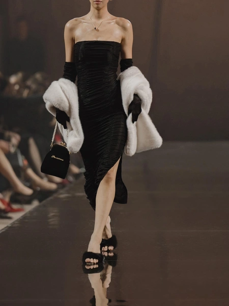 Выбирая подарок женщине, интересующейся модой и влюбленной в Париж, обратите внимание на платье прилегающего силуэта с открытыми плечами и прямой юбкой с плотной посадкой по бедрам и высоким разрезом сбоку из новой коллекции Parisienne бренда Lichi. Модель выполнена из приятной к телу эластичной ткани с мелкими вертикальными сборками и имеет в комплекте высокие перчатки в тон. Она буквально создана для того, чтобы притягивать взгляды.
