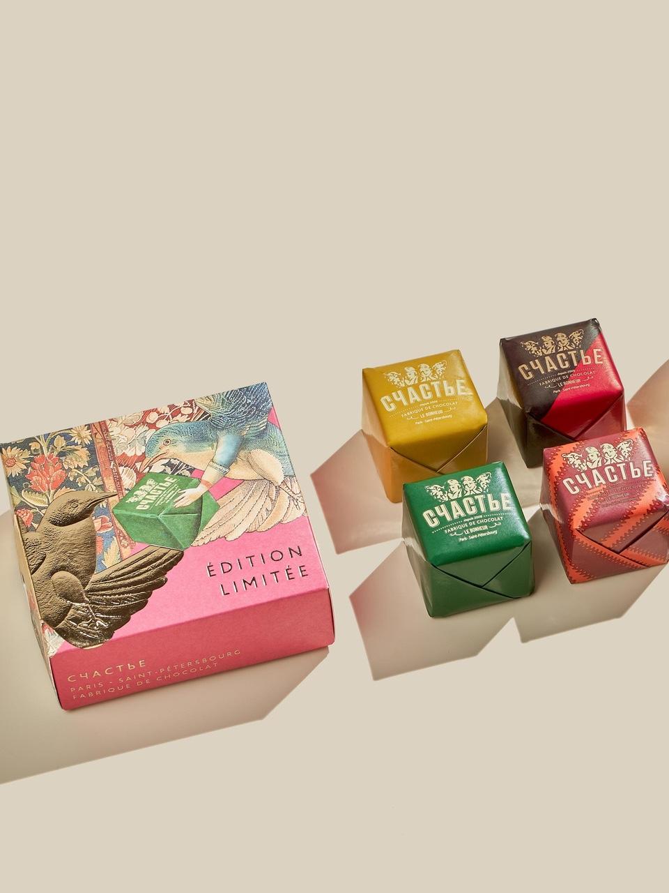 Подарочный набор конфет-пралине шоколадной фабрики «Счастье» можно собрать из четырех разных вкусов, но мы советуем обратить внимание на новинки сезона: пралине с белыми грибами и можжевельником в горьком шоколаде, пралине с брусникой и кедровыми орехами в молочном шоколаде, пралине с кардамоном, инжиром и семенами чиа в молочном шоколаде и пралине с виски и изюмом в горьком шоколаде. Хороший подарок для женщины, которая любит изысканные десерты.