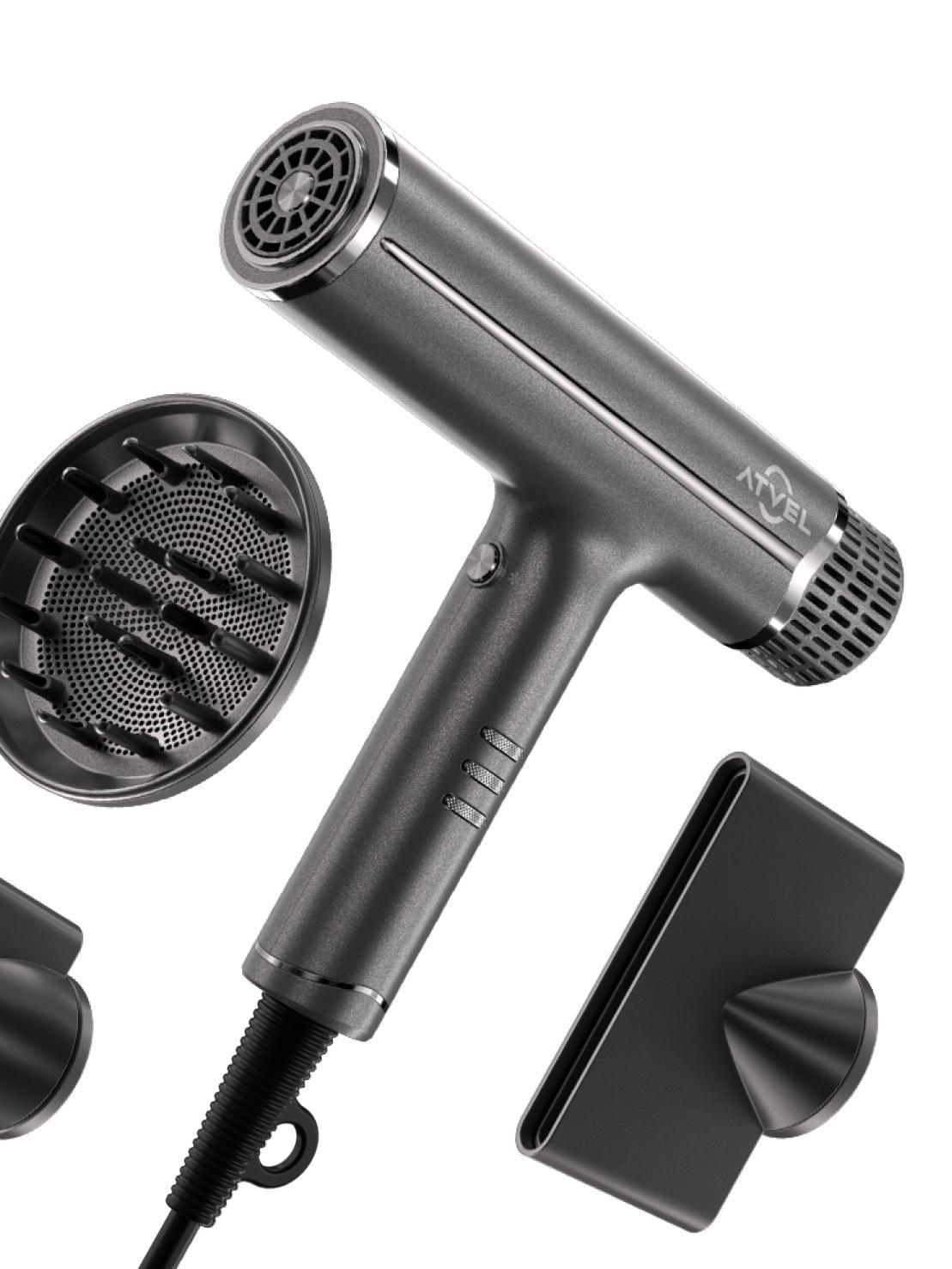 Фен Atvel AirJet HD6 Gray оснащен электронной системой управления. У модели три скорости воздушного потока и четыре температурных режима. Кнопки управления располагаются спереди. Тип мотора — ЕС. Скорость воздушного потока достигает 25 м/сек. Холодный обдув позволяет надежно зафиксировать прическу, ионизация снимает с волос статическое электричество. Съемная задняя решетка облегчает удаление застрявших волос.