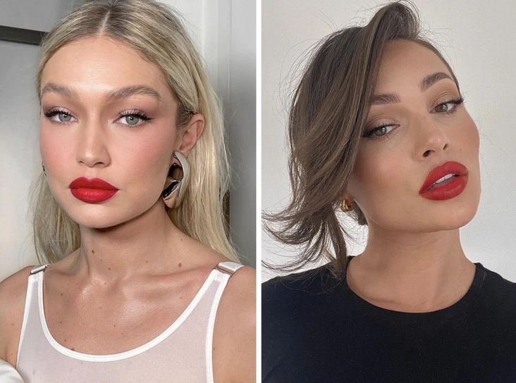 Красные губы с ровным контуром и безупречным тоном никогда не выйдут из моды. Для классического макияжа выбирайте ярко-красную помаду с холодным или теплым подтоном — выбор зависит от вашего тона кожи (читайте также: Идеальный красный: как выбрать оттенок помады, который подходит именно вам). Красные губы — яркий акцент, который не требует дополнений, но при желании макияж можно дополнить классической или мягкой стрелкой и подчеркнутой складкой века.