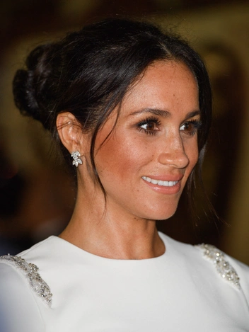 Сассекская определенно не из тех, кто любит монументальные укладки с высокой степенью фиксации. Для встречи с королем Тупоу VI и королевой Нанасипаулу в Тонга к эффектному вечернему платью белого цвета сделала высокую прическу с аккуратно скрученными в пучок на затылке волосами, однако оставила свои фирменные пряди у лица, что добавило ее бьюти-образу расслабленности. Такую вечернюю укладку легко повторить в домашних условиях.