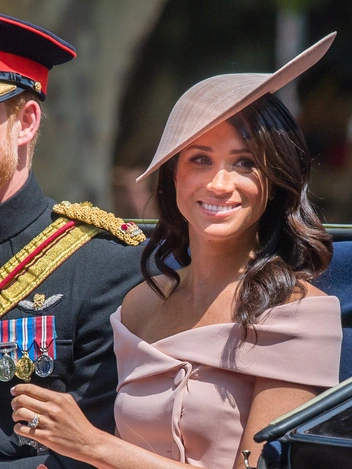 Этот образ Сассекской стал одним из любимых среди королевских поклонников. Новоиспеченная супруга принца Гарри прибыла на свое первое празднование официального дня рождения Ее Величества в нежном бледно-розовом комплекте и с крупными локонами, как бы намекая на свой голливудский бэкграунд. Асиммтеричный головной убор смотрелся особенно эффектно на фоне гламурных локонов.