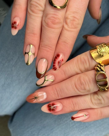 С помощью красного лака можно сделать необычные абстрактные нейл-арты и сочетать их с другими дизайнами. Один из вариантов — маникюр, напоминающий тягучие карамельные подтеки поверх спелого красного яблока. Дизайн, кстати, можно сделать объемным с помощью специального геля. Поклонницам сложных нейл-артов понравится маникюр с обилием деталей: попросите мастера нарисовать на ногтях несколько разных узоров в красных оттенках.