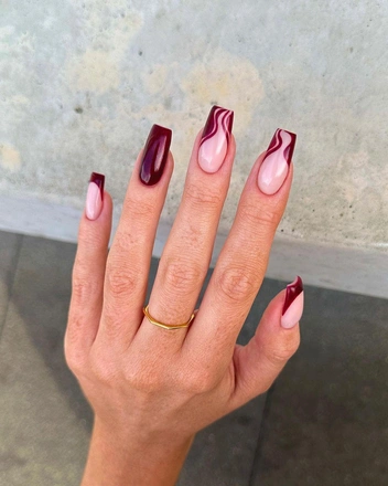 Полоски, тонкие и толстые линии, острые и плавные углы — вот еще один вариант маникюра, который выигрышно будет смотреться в красных цветах. Геометричный дизайн подойдет для любой формы и длины ногтей, а выполнить его можно в любом оттенке красной палитры (читайте также: Маникюр для длинных ногтей: 15 идей на любой случай). Сочетать рисунки можно с однотонным покрытием на нескольких пальцах или френчем.