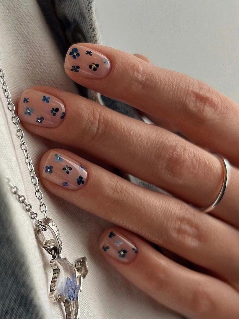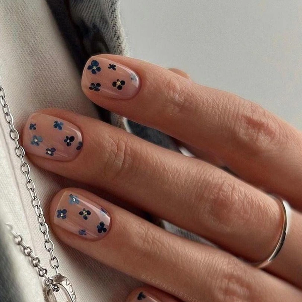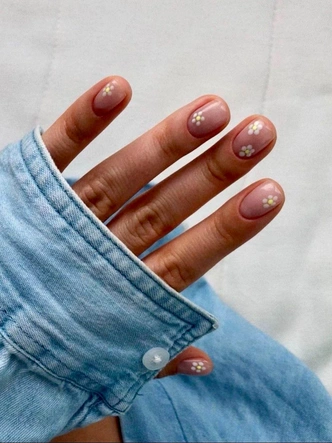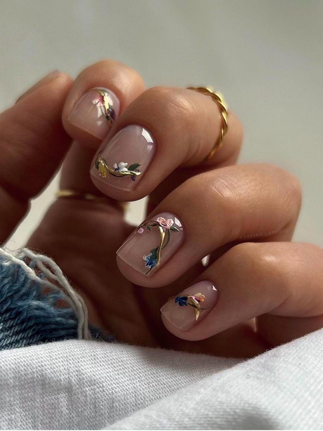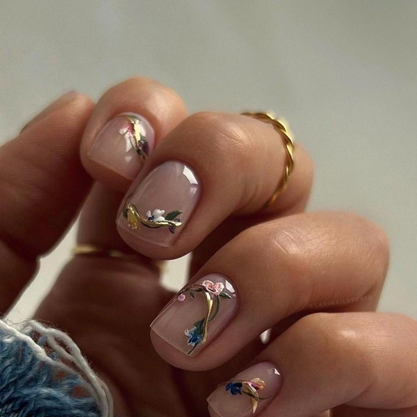 Минималистичные цветы возвращаются на ногти, но уже без романтических излишеств. Это скорее деталь, чем акцент — легкое напоминание о начале весны. Один-два цветка, выполненные в приглушенных тонах, придают маникюру индивидуальность, не перегружая образ. На нейтральных фонах — молочном, кремовом, светло-бежевом — они выглядят особенно чисто. Такой денежный маникюр на март 2026 будет уместен и в офисе, и на выходных, когда хочется немного тепла и женственности.