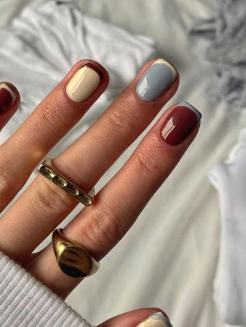 Сочетание приглушенных оттенков — бордо, оливкового, серо-голубого, пыльной розы — отражает всю палитру осени. Такой денежный маникюр на октябрь 2025 подчеркивает креативность и способность смотреть на вещи с разных сторон. Он особенно актуален для тех, кто работает в творческих профессиях, и для тех, кто хочет добавить в жизнь больше энергии и красок.