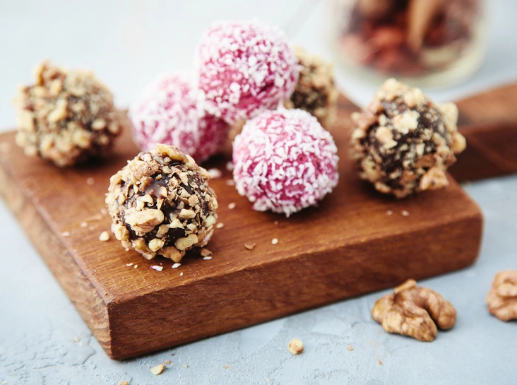 Готовим глазурь: растопленное масло какао соединяем с просеянным через сито какао-порошком и кэробом, взбиваем венчиком до однородной массы. Подмороженные конфетки опускаем в жидкую глазурь и посыпаем ореховой крошкой, чтобы глазурь подстыла – отправляем шарики в холодильник.
