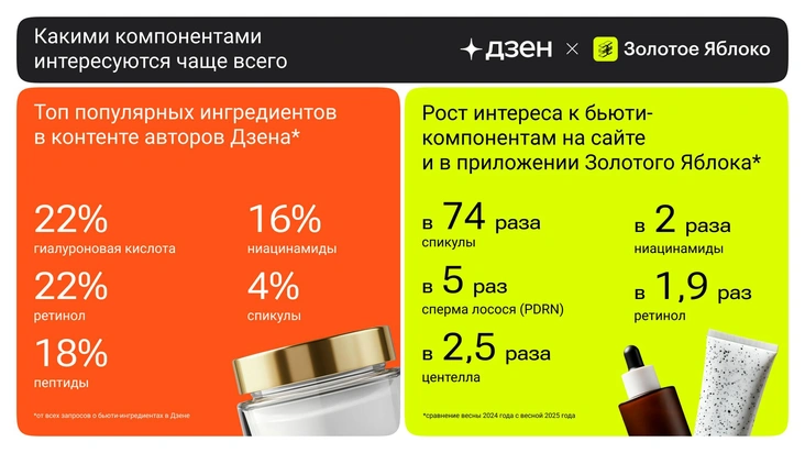 Интерес к бьюти-ингредиентам растет: с начала 2024 по март 2025 в Дзене вышло на 16% больше публикаций авторов с их упоминанием. Чаще всего они рассказывали про гиалуроновую кислоту (22%) и ниацинамиды (17%). Анализ запросов на сайте и в приложении «Золотого Яблока» подтвердил тренд: бьюти-ретейлер выделил 10 самых популярных ингредиентов сезона: