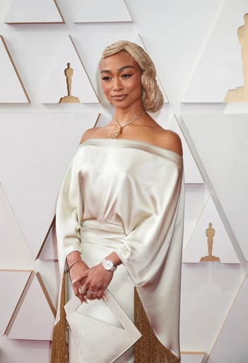 В этом образе актрисы Тати Габриэль на Оскаре нам нравится все: и укладка в стиле «Великого Гэтсби», и золотистый акцент в уголках глаз. Чтобы повторить макияж, вам понадобится либо золотистая фольга, либо золотые металлические тени. Фольгу лучше прикрепить на базу для макияжа.