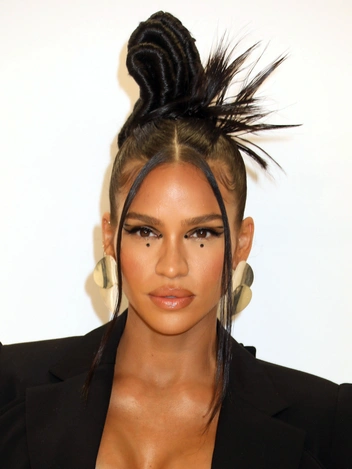 Образ певицы Кэсси понравится тем, кто любит креативный макияж. Чтобы его повторить, вам понадобиться черная подводка или стойкий карандаш. Веко оставьте «голым» и проведите линии как на фотографии. Чтобы стрелки получились ровными, смотрите прямо в зеркало и рисуйте их с открытыми глазами. В уголки можно наклеить черные стразы, а губы подвести коричневым карандашом, а середину прокрасить нюдовой помадой с глянцевым финишем.