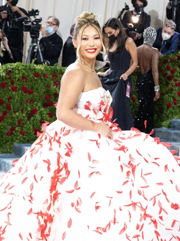 Спортсменка Хлоя Ким появилась на Met Gala с макияжем в красных оттенках и кристаллами в тон. Чтобы не переборщить с красным, затемнить складку века стоит коричневыми оттенками, а затем нанести на все подвижное веко сияющие тени мелкого помола. Также стоит немного добавить красных сияющих теней так, чтобы покрытие были полупрозрачным.