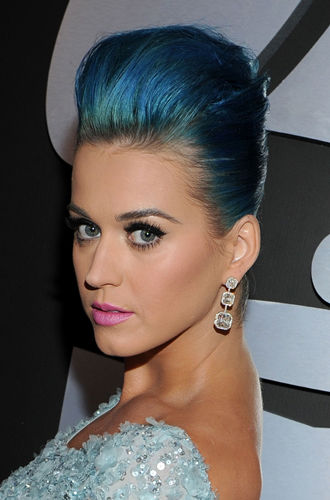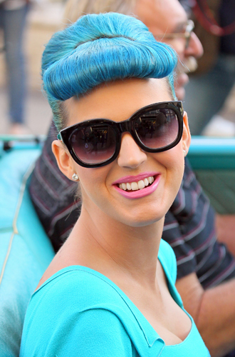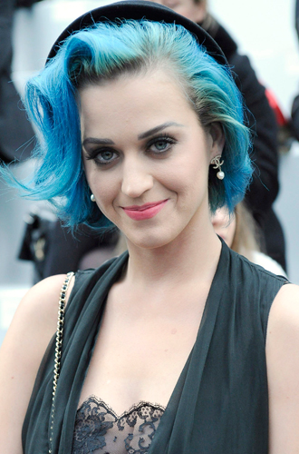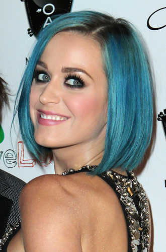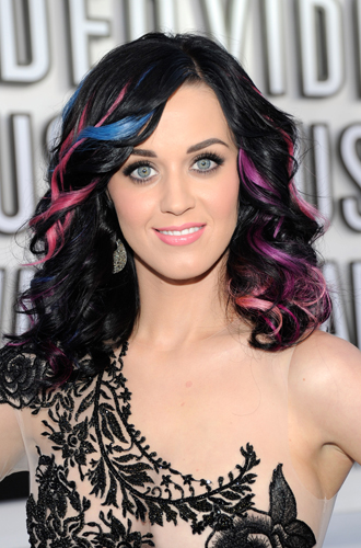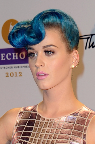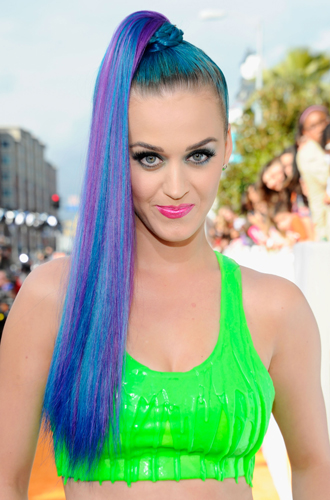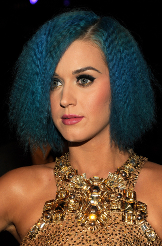Эксперименты Перри с цветом волос начались в 2010 году с цветных париков, и синий цвет был прекрасен. Здесь нужно отдать должное и визажистам, подобравшим для такого фееричного образа эстетично правильный мейкап ─ графичные стрелки, которые время от времени тоже разбавлялись цветом, и розовую губную помаду «бабл гам». А вот и его трансформации, которые подтверждали, что «цвет настроения» для Кэти не пустые слова.